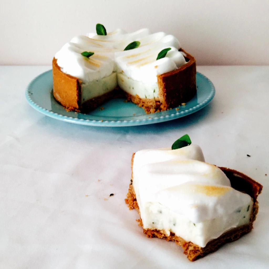Base sablee de almendras, cremoso de limon y albahaca y merengue.